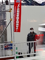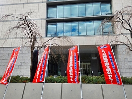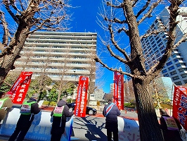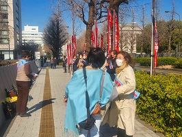 3月11日、本社前宣伝。3・11から14年。JAL本社が入っている野村不動産ビルでは半旗を掲揚。大震災と同日、解雇無効を求める客乗地裁初回裁判が開かれた。私たちの解雇14年にも思いを馳せつつ、連発するJALの事故、不安全事象を止めるためにも争議の解決・モノ言える職場・風通しのよい職場を鳥取社長に求めた。
