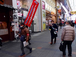2月18日 伏見大手筋宣伝(主催:京都支える会)、争議支援京都烏丸宣伝行動(主催:京都総評)。時折、風花が舞う京都で訴え。支援者や地元の方たちの励ましに今日も気持ちは温かく。写真は大手筋宣伝。