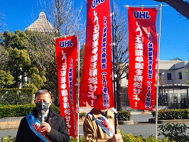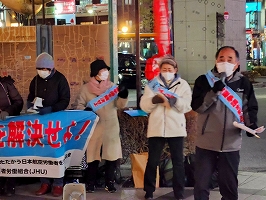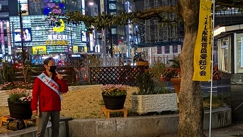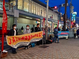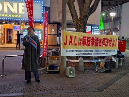 2月9日、立川駅定例宣伝(主催:JAL闘争支援三多摩共闘会議)青空が広がり日射しがあっても風が冷たい日曜の午後。大勢の市民が行き交う中、何人かの方から励ましの声をかけて頂いた。82年2月9日は羽田沖事故が起こった日。管理強化、職場の疲弊と安全問題についても組合から訴えた。