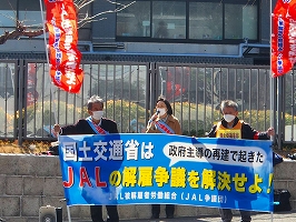 2月21日2月25日国交省前宣伝。久しぶりに暖かな陽射しでした。モノ言う労働者を排除し、労働者の権利と人権を奪った解雇は決して許さない。飲酒問題や安全トラブルが続く背景はJALの経営体質と無関係ではない。国交省は一企業の問題だと逃げるのでなく、争議を解決し安全な航空会社にする責任があります。
