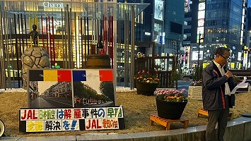 1月28日有楽町宣伝。今、マスコミ業界でも重大な人権侵害が問題に。JALは立派な人権方針を掲げているが不誠実、背を向けたままの対応継続。失われた15年を象徴する切なくも力強いトランペットの音色が銀座に響きわたり、街行く方々もこの理不尽で不当な解雇への訴えに注目してくださいました。