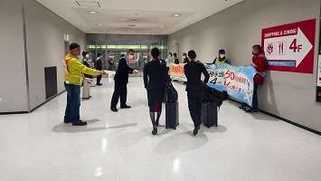 2月28日成田空港宣伝。愛媛在住の争議団員も参加し賑やかな宣伝になりました。出発階では何人もの方から頑張って下さいとの反応がありました。会社の玄関前では、襷をかけた争議団員が多いせいか、日本語チラシは全部なくなりました。15年経過しても顔見知りの方が声をかけて下さり嬉しく思います。