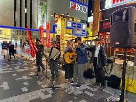 2月27日松山市駅前宣伝行動。寒さ和らぎ、春の気配の松山。今夜は支援者の皆様にマイクを渡し、それぞれの想いを訴えていただいた。四国トレインズの歌声も夜空に響き渡り、立ち止まって聞き入る方々も。手応えのある宣伝となった。