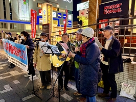 1月27日定例横浜宣伝です。チラシはたくさんの方に受け取っていただきました。低学年の男子連れのお母さんが、「ビラに詳しく書いてあるのですよね?家に帰って良く読みます。頑張って!」歌による訴えでは、飛び入り参加が3名程あり、連帯してくれました。