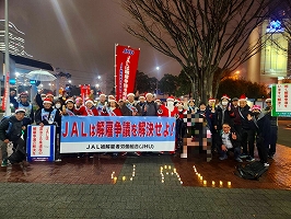 12月25日桜木町駅前Xmas宣伝です。サンタの衣装に扮し、社会派トランペッターの演奏とうたごえ合唱で始まった宣伝は今年も大盛り上がりでした。若い人も知っている曲が流れると高校生が飛び入り参加。何組もの若者グループが何をやっているのだろうと関心を持って集まっていました。チラシも早々になくなり、クリスマスを楽しむ皆さんにアピールてきました。小さいキャンドルで地面に「JAL」という文字が描かれとても感動的でした。来年こそは会社に解決を決断させ、皆が心から笑える一年にしようと決意しました。支援者の皆様、今年も本当に有り難うございました。