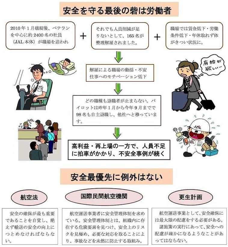 行き過ぎた人員削減が、職場にモチべーション低下と不安をもたらしている。職場では退職者が後を絶たず人員不足に拍車をかけている。安全より利益優先の経営哲学により、不 安全事例も後を絶たず、更生計画が求める「安全が大前提」が守られていない。